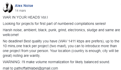 Looking for projects for the first part of numbered compilations series! Harsh noise, ambient, black, punk, grind, electronics, sludge and same are welcome!”